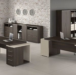 Estação de Trabalho Prius com tampos confeccionado em MDP de 40mm de espessura engrossurado com borda de 1mm , painel lateral de mesa em MDP de 25mm e armários e gaveteiros com corpo de 15mm .