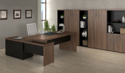 * Mesa Diretor em L com armário pedestal e tampo principal com bouvard
